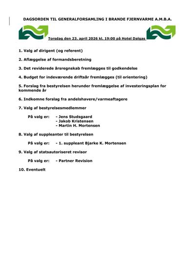 Brande Fjernvarme afholder generalforsamling på Hotel Dalgas torsdag d. 23. april kl. 19.00. Se dagsorden for generalforsamlingen her: